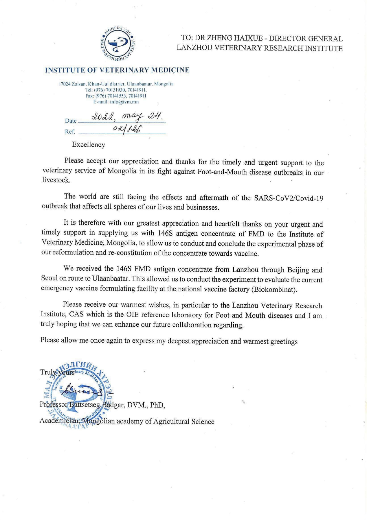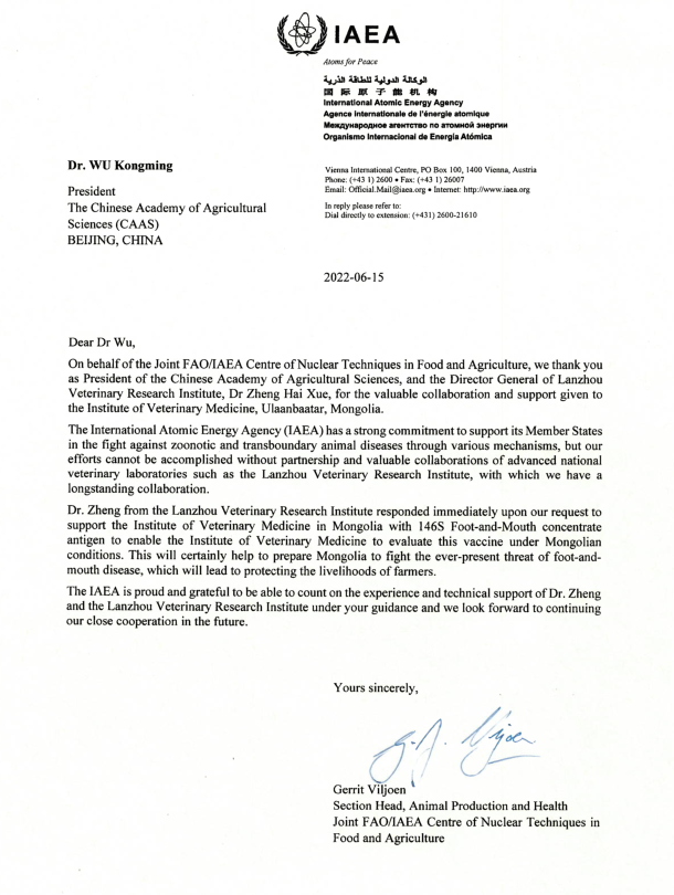 2022年5月24日,蒙古国农业科学院院士Battsetseg Badgar向中国农业科学院院长吴孔明院士和兰州兽医研究所所长郑海学来信致谢,对兰州兽医研究所及时向蒙古国兽医研究所提供支持表示衷心感谢。6月15日,世界粮农组织/国际原子能机构(FAO/IAEA)粮食和农业核技术联合中心动物生产和卫生部主席Gerrit Viljoen致信吴孔明院长。他表示,在IAEA提出向蒙古国兽医研究所提供请求后,兰州兽医研究所郑海学所长立即组织国家口蹄疫参考实验室对蒙古国流行毒株和我所疫苗匹配性进行评估,及时向蒙古国兽医研究所提供浓缩抗原,为快速评估疫苗有效性、快速战胜困扰畜牧业发展的口蹄疫疫情提供了重要的帮助。同时指出,IAEA通过不同的机制致力于帮助各成员国进行动物传染病和跨界动物疾病的防控,而兰州兽医研究所与IAEA建立了良好的长期合作关系,希望双方继续开展紧密合作,以帮助更多成员国有效防控动物疫病。
