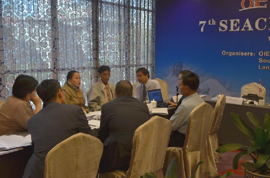 会议期间东南亚次区域参考实验室、世界口蹄疫参考实验室、区域参考实验室及各国代表就目前本区域内的口蹄疫病流行形势、实验室诊断和检疫技术、疫苗和免疫等方面的科研工作和今后计划向大会报告,还围绕各实验室口蹄疫防控能力试验和质量保证方面的检验和困难进行交流和讨论,并制定出2013年-2015年SEACFMD的重点计划。