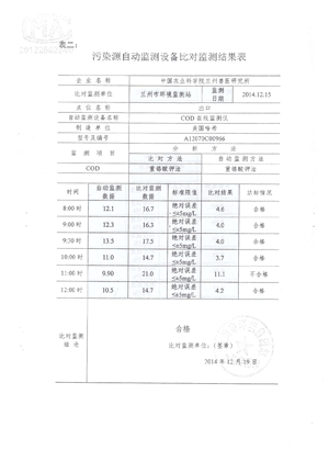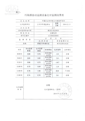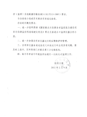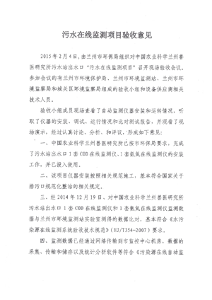 验收小组通过现场查看污水站出水口COD在线监测仪和氨氮在线监测仪的安装、运转情况,认真听取仪器的安装、调试、运行情况和监测数据比对报告,经过认真讨论、分析和评议后,一致认为,兰州兽医研究所按照市环保局要求和相关施工规范,完成了污水站出水口1套COD在线监测仪和1套氨氮在线监测仪的安装和使用,符合国家关于排污口规范化整治的相关规定;监测数据与兰州市环境监测站实验室测得的数据比对结果,基本符合《水污染源在线监测系统验收技术规范》要求;监测数据的采集、传输和储存以及统计分析软件等符合《污染源在线自动监控(监测)系统数据传输标准》要求;同意兰州兽医所“污水在线监测项目”通过验收。