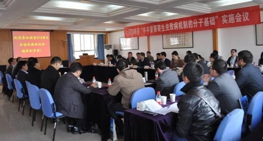 2015年4月1-3日,2015年度国家973项目“牛羊重要寄生虫致病机制的分子基础”项目实施会在我所召开。科技部基础研究管理中心李霄处长,中国农业科学院雷茂良副院长、科技管理局陆建中副局长、刘蓉蓉副处长,甘肃省科技厅王彬副厅长、刘改霞处长,项目责任专家西南大学动物科技学院张家骅教授、清华大学生命科学学院张荣庆教授、西北农林科技大学动物科技学院杨公社教授,项目组专家中国兽医药品监察所所长才学鹏研究员、中国农业大学汪明教授莅临会议并致辞,项目实施会开幕式由我所所长殷宏研究员主持。