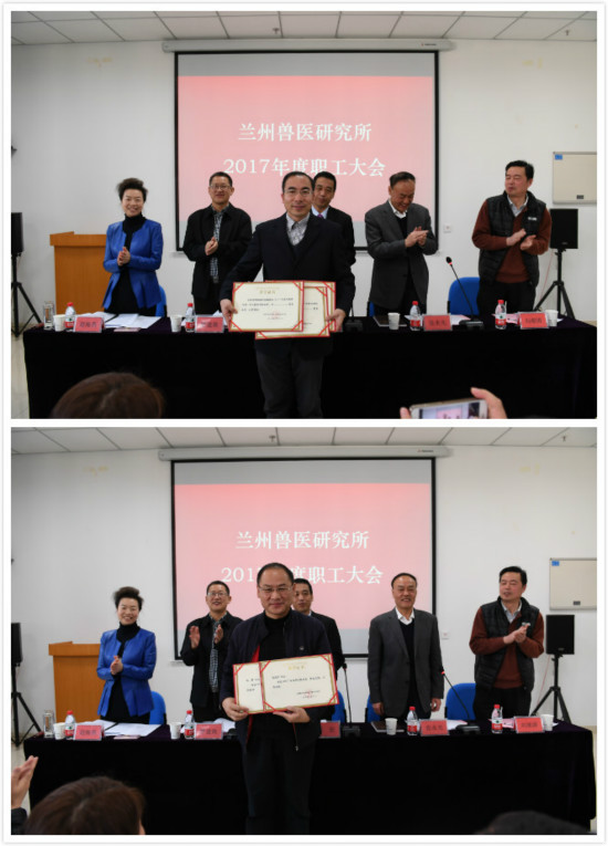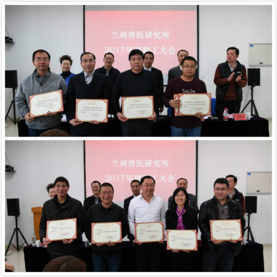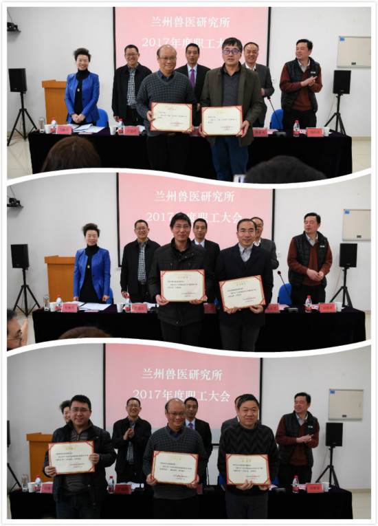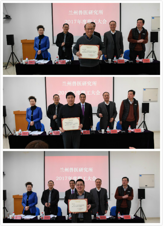 会上,罗建勋副所长宣读了兰州兽医研究所关于表彰2017年度科研工作取得突出贡献的创新团队及个人的决定和2017年度获得各种奖励的部门及个人名单。所领导班子分别为2017年度工作量完成前三名的创新团队、发表SCI论文单篇影响因子最高的个人、获得授权专利数前二的创新团队、以我所为第一单位获得省部级奖励的创新团队、申请国家和省部级科研项目经费排名前三的创新团队、发表SCI论文最多的个人、以我所为第一单位获得一类新兽药证书的创新团队、以我所为第一单位通过国家/行业标准的创新团队、以我所为第一单位出版的专著、在院所网站发布新闻报道最多的个人、在科技兴农国家产业技术体系以及科技扶贫工作中表现突出的个人颁发了荣誉证书。