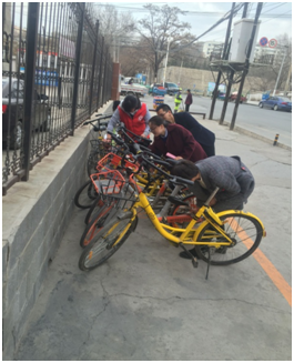活动在3月5日下午14:30开始,参加活动的志愿者们先对乱放在我所家属区内的共享单车进行清理,并搬离出小区摆放在辖区指定停放位上,接着把盐场堡社区道路两边随意摆放的单车搬放至路段指定位置上,大家紧密配合,细致入微的对布满灰尘的共享单车进行清洗。经过3小时的奋战,志愿者们共成功清洗共享单车20辆。原本脏乱不堪的共享单车重新恢复了往日的整洁靓丽。与其此同,志愿者们还向辖区内的学生、家长以及居民发放“共享单车 共享文明”倡议书并进行宣传。