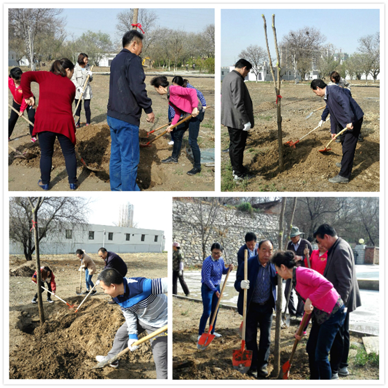 植树现场,党员们干劲十足,挥洒汗水,三五人一组,分工合作,挖土、扶苗、栽树、培土、浇水,一派热火朝天的景象。经过大家的共同努力,新栽种的槐树迎风挺立,生机盎然。