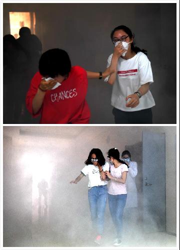 下午3点58分,随着消防教官在科研大楼一楼释放烟雾,消防演练拉开了帷幕。综合处接到报警电话后第一时间将火情报告安全生产工作领导小组组长,组长指示立即启动应急预案,应急救援指挥中心,各应急小组即刻进入应急状态。伴着尖鸣的警报声和火情广播,楼内人员用湿毛巾遮住口鼻,俯身低头,按照指定路线有序撤离了模拟火灾现场。科研大楼现场模拟了突发火灾后如何组织职工和学生快速从现场紧急疏散逃生的过程。