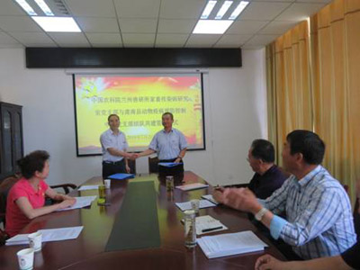 为更好地推进所地合作发展,加快民族地区脱贫攻坚步伐和乡村振兴战略进程,在所党委的领导和支持下,兰州兽医研究所家畜传染病研究室党支部与甘肃省张掖市肃南裕固族自治县动物疫病预防控制中心党支部紧紧围绕“活动共建、人才共育、资源共享”的目标,积极开展所地党组织结对共建活动。2018年7月20日,在兰州兽医研究所党委副书记赵海燕和肃南裕固族自治县农牧委兽医局局长代建聪的见证下,双方党支部书记刘永生和王凯圆满完成“党建共建结对”签约,并开展了《草食动物细菌病创新团队肃南实验基地》挂牌等活动。
