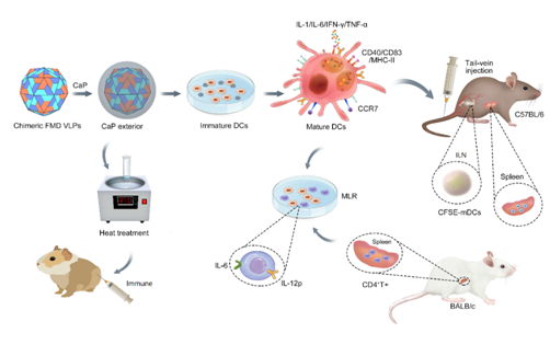 本研究利用仿生矿化的原理对口蹄疫VLPs进行生物矿化修饰,在VLPs表面形成钙矿化层。极端耐热性试验显示,矿化层显著提高了VLPs的耐热性,而且37℃放置7天的矿化VLPs和4℃保存的矿化VLPs诱发的免疫反应相当。此外,研究从抗原递呈角度揭示了矿化VLPs能更高效的被免疫细胞摄取,并诱导树突状细胞的成熟,进一步活化T细胞使其分化。在本研究基础上,兽用纳米材料及应用课题组已将此矿化思路和技术进一步推广到常规灭活疫苗的研发中,并已获得相关国内国际专利,不仅为获得口蹄疫系列耐热疫苗提供更多选择,更为获得稳定的新型优势疫苗提供了参考。
