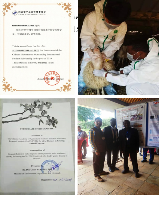 尼优奎希米拉·阿尔弗雷德自入学以来热爱中国文化,遵纪守法,刻苦学习,乐于助人,成绩优异,积极参加社会实践和学术活动,综合表现突出。该生主要从事重大动物疫病防控研究,利用兰州兽医所研制的小反刍兽疫病毒快速检测技术对布隆迪的小反刍兽疫进行检测,首次证实小反刍兽疫病毒在布隆迪的发生,并对该病毒来源进行分析,为布隆迪政府制定小反刍兽疫病毒疫情应急计划提供科技支撑,避免了重大动物疫病的扩散及跨国传播的风险,得到了布隆迪环境、农业和畜牧部部长的高度肯定,并获颁荣誉证书。该生作为受非盟邀请的10个非洲青年代表之一,于2019年11月参加了在肯尼亚内罗毕举行的第二届小反刍动物全球研究与技术论坛并作报告。